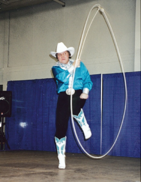 Her routine is choreographed to western music and her traditional style and tricks are those seen in the early years of the wild west shows and rodeos.