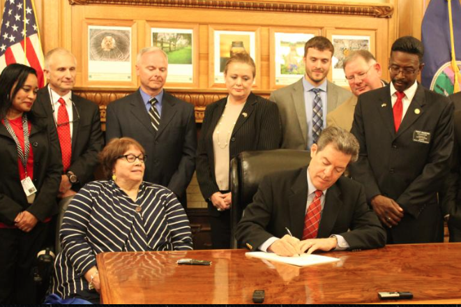 Gov. Sam Brownback signed Senate Bill 402 on Monday at the Statehouse flanked by legislative supporters of the measure.