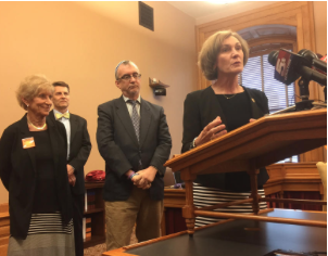 Members of a coalition asking Kansas Gov. Sam Brownback to convene a meeting on gun violence include (left to right) Judy L. Sherry of Grandparents Against Gun Violence; Dennis Dobson of Heeding God’s Call; Rabbi Moti Rieber of Kansas Interfaith Action; and Rep. Barbara Bollier, a Mission Hills Republican. CREDIT JIM MCLEAN / HEARTLAND HEALTH MONITOR