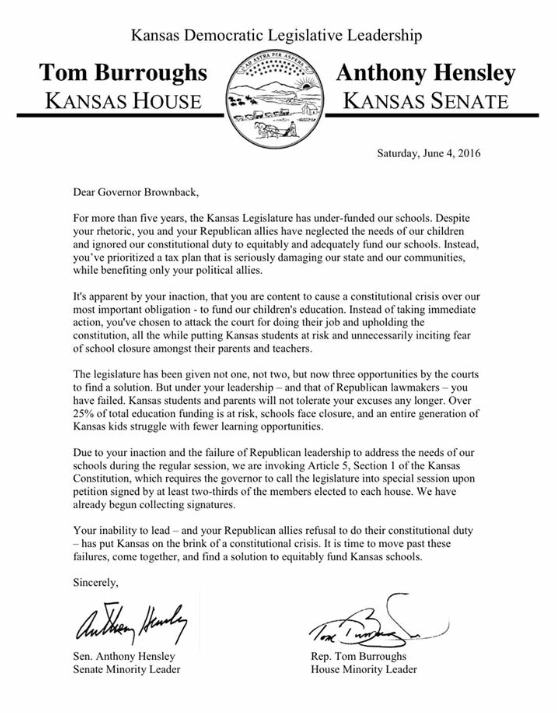 The Topeka Capital-Journal reports that House Minority Leader Tom Burroughs and Senate Minority Leader Anthony Hensley said in a letter sent Saturday evening to Gov. Sam Brownback that they’ve begun collecting signatures to force the governor to call a special session to find a solution to “equitably fund Kansas schools.”