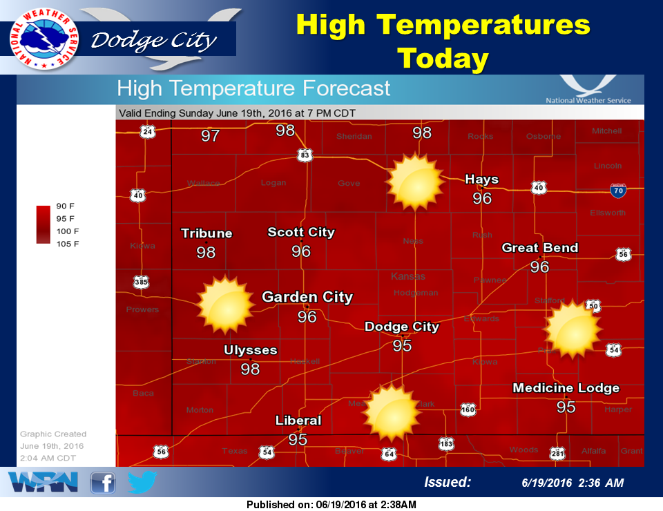 Temperatures are expected to be hot this afternoon with highs in the 95 to 100 degree range. Heat index values will be 98 to 104 degrees. Hot conditions continue throughout the work week as a stagnant air-mass settles into the region.