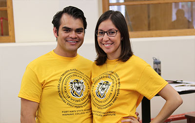 FHSU graduates Hector Villanueva and Alma Hidalgo were right in the thick of things Wednesday morning as high school students from across Kansas, Colorado and Missouri climbed off buses to participate in Fort Hays State’s first Hispanic College Institute.