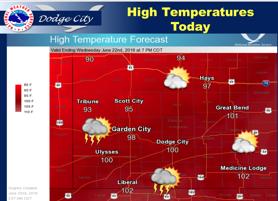 Partly cloudy today with isolated thunderstorms possible late. Highs in the 90s to a little above 100 this afternoon.