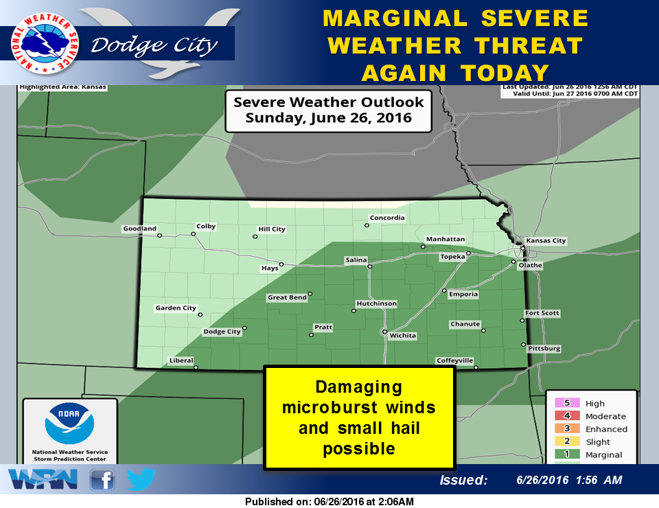 FileLA weak cold front will extend from eastern Kansas into the northern Texas Panhandle this afternoon. Moist and unstable air will continue across much of Kansas behind the front, and an upper level trough will support thunderstorm development again in the afternoon, especially from south central into southeast Kansas. The primary threat will be damaging microburst winds, although small hail is possible. Locally heavy rainfall may occur.