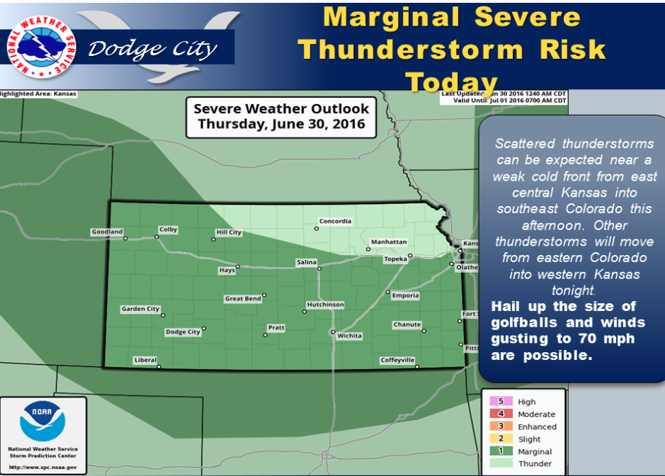 Thunderstorms can be expected to develop near a weak stationary front from eastern Kansas to the northern Texas Panhandle and near a reinforcing cold front that will move into northern Kansas this afternoon. Some of the thunderstorms will be severe and may produce hail up to the size of golfballs and winds to 60-70 mph.
