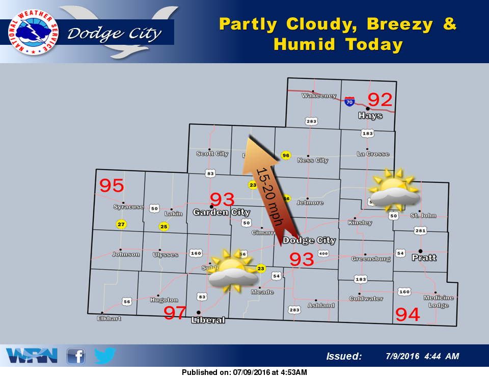 FileLWarmer temperatures can be expected today with highs in the lower to mid 90s. Winds will be from the south-southeast at 10 to 20 mph. An isolated thunderstorm can’t be ruled out late this afternoon and evening, mainly across far southwestern Kansas.