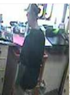 A suspect described as a white male, 30-40 years of age, medium height, slender build and wearing a black short sleeve t-shirt over a gray long sleeve shirt, baggy gray pants and white and gray tennis shoes, blue and black ball cap and dark glasses.