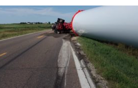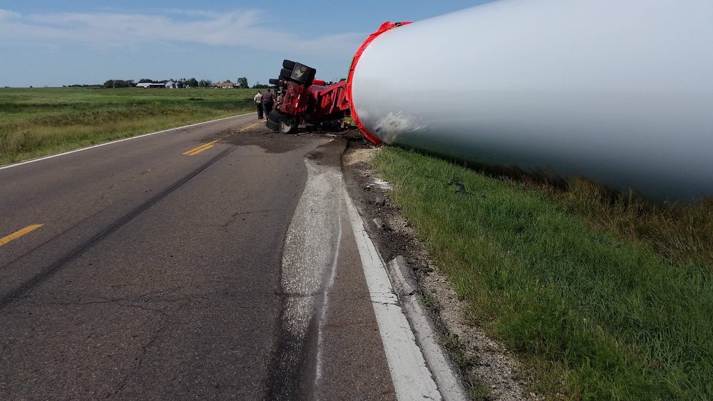 The semi load is a wind generator tower that will need to be lifted out of the ditch and placed on a different trailer.