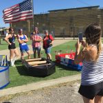 According to Braun, “we struggled to come up with a theme and we wanted it to be somewhat bank-related. I’ve got two teen-aged boys that love Pokemon.” So Braun dug out one of her boys’old Halloween costumes and then “we named our boat the ‘S.S. Pokémoney’,” she said with a completely straight face. Kelly Fross, Bank of Hays customer service representative and Shelby Crabill, bank teller, struggled to look fierce as they sat beside Braun in front of their boat prior to the Soggy Bottom Challenge.
