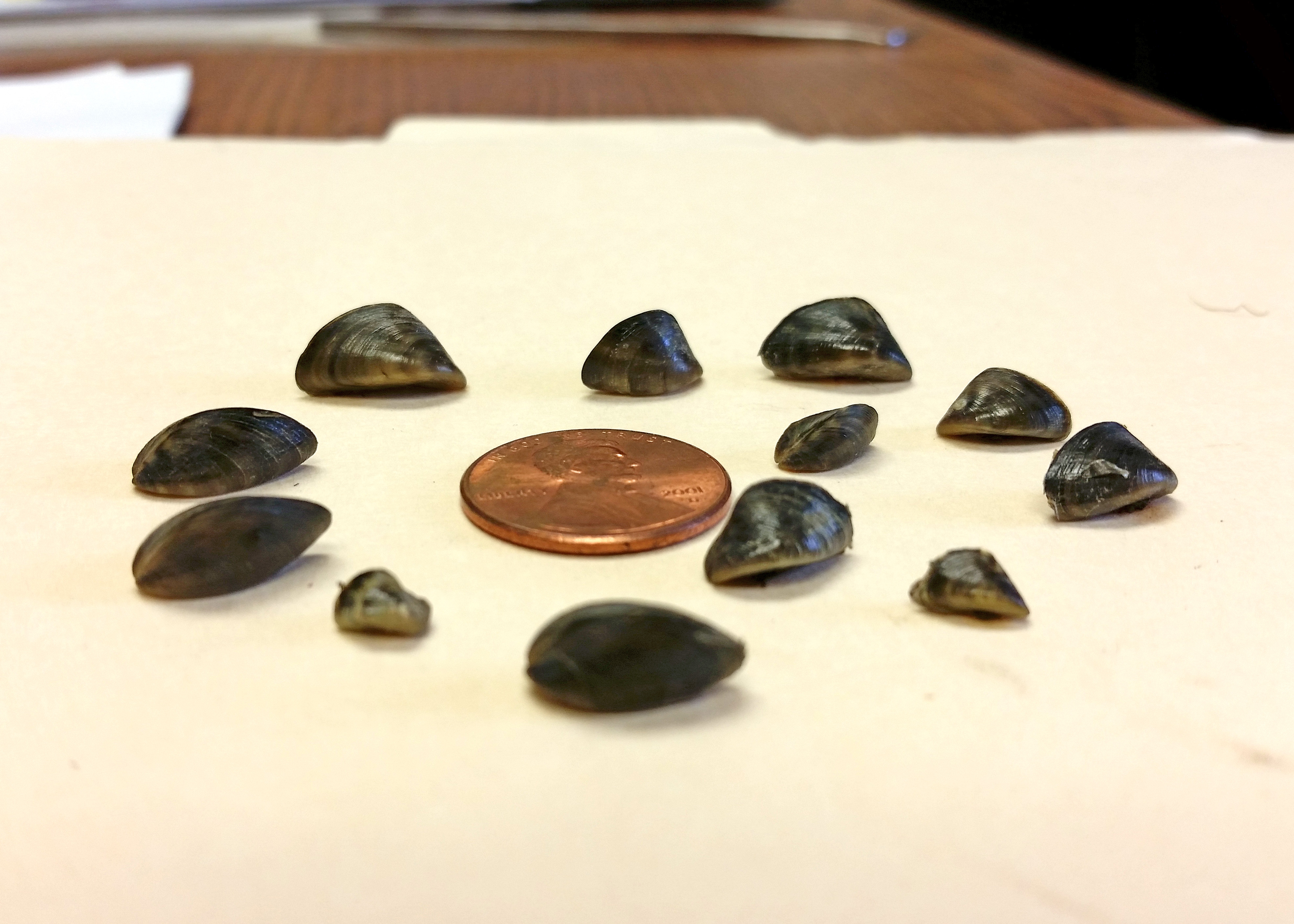 Zebra mussels are dime-sized mollusks with striped, sharp-edged, two-part shells. They can produce huge populations in a short time and do not require a host fish to reproduce. A large female zebra mussel can produce 1 million eggs, and then fertilized eggs develop into microscopic veligers that are invisible to the naked eye. Veligers drift in the water for at least two weeks before they settle out as young mussels which quickly grow to adult size and reproduce within a few months.