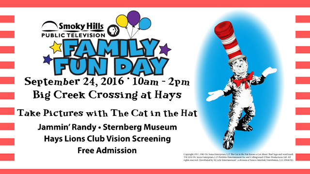 BUNKER HILL – Smoky Hills Public Television is gearing up for the 5th annual Family Fun Day in Hays on Sept. 24, featuring The Cat in the Hat. This free family event will again be held at Big Creek Crossing from 10 a.m. to 2 p.m.