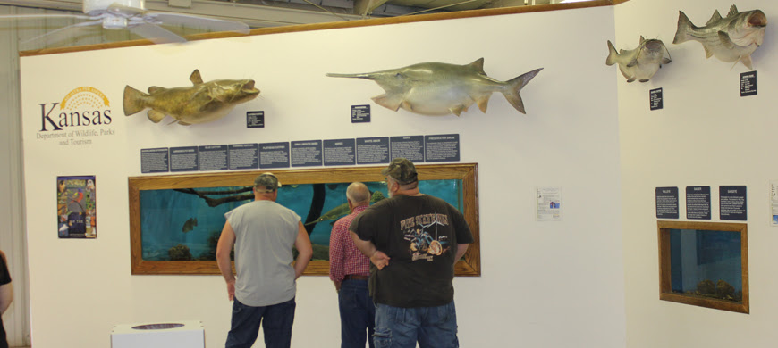 KDWPT’s permanent booth and display is located in the Eisenhower Building. There you’ll find four aquariums filled with Kansas fish and terrariums displaying live Kansas snakes. Replicas of all the Kansas State Record Fish adorn the walls around the aquariums, and there are some replica deer mounts of actual Kansas trophy whitetails. At the booth you’ll find knowledgeable staff ready to answer your questions, and you can pick up the latest hunting and fishing regulations pamphlets, as well as the 2016 Kansas Hunting Atlas. A variety of park, public lands, and general information brochures are also on hand.