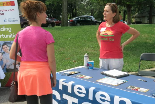 Helen Stoll answers questions at Vikingpalooza, a fundraiser for Shawnee Mission West High School athletics. Stoll, a Democrat, doesn’t think moderate Republicans can fix problems in Topeka.