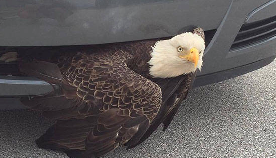 GREEN COVE SPRINGS, Fla. (AP) — A bald eagle that somehow managed to get wedged in the front grill of a car was freed unharmed after a passing motorist noticed the bird.