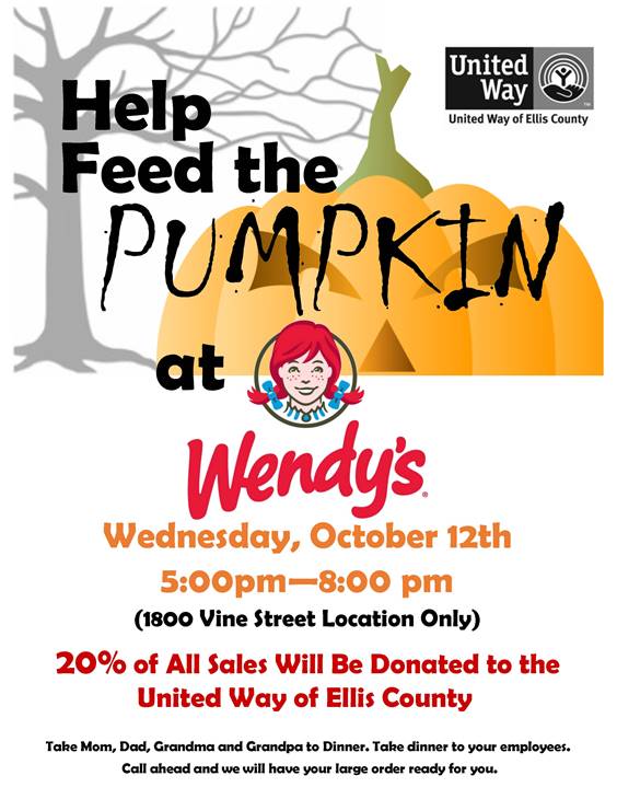 Wendy’s will donate portion of Wednesday sales to United Way Posted on October 12, 2016October 12, 2016 From 5 to 8 p.m. Wednesday, 20 percent of all sales at the 1800 Vine Wendy’s will be donated to United Way of Ellis County. Click the image for more information.