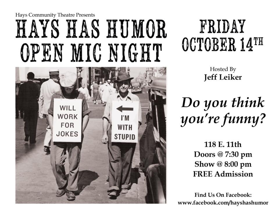 Doors open for the event, which will be at Hays Community Theater, 118 E. 11th, at 7:30 p.m., with the show starting at 8 p.m. Reserve a stage time at facebook.com/hayshashumor.