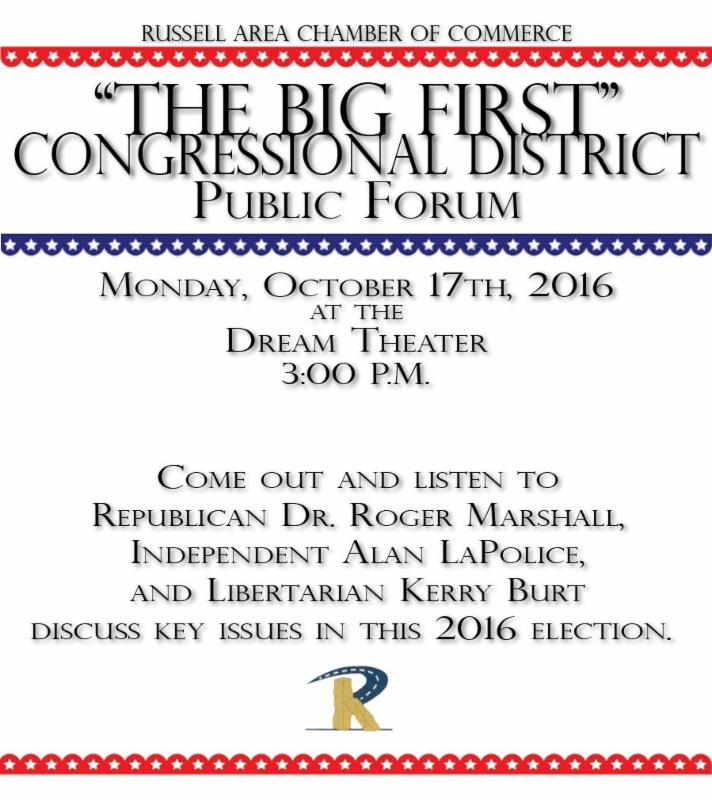 The forum, held at the Dream Theater on Monday, included three candidates for the First Congressional District seat. Republican candidate Dr. Roger Marshall defeated incumbent Tim Huelskamp in the August primary. Challenging Marshall are Independent Alan LaPolice and Libertarian Kerry Burt.