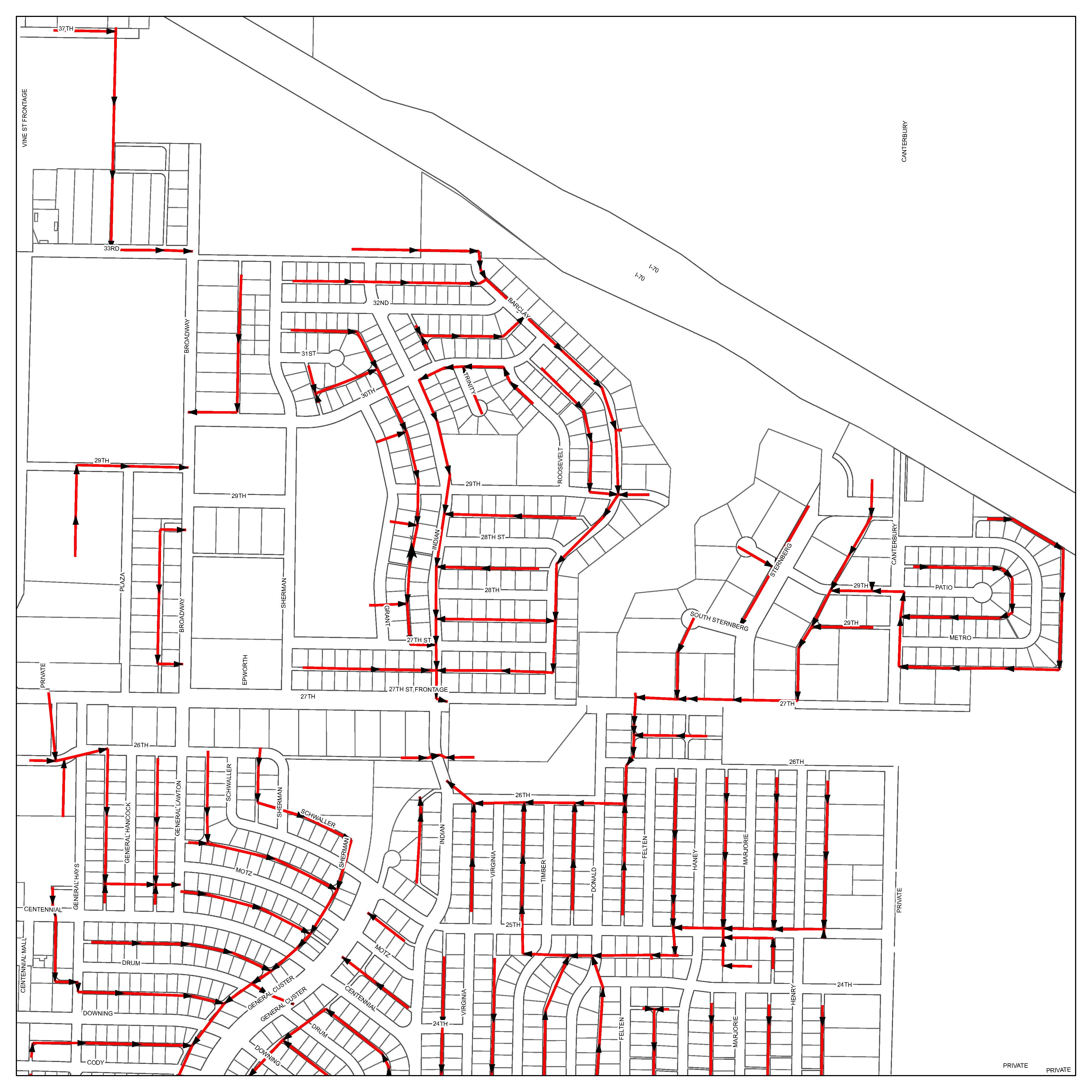 On the map, the red lines indicating the 2016 project of 19 miles. The area that will be cleaned is east of Vine Street, from 37th to 33rd continuing south of I-70 down to Highway 40. Crews will also be cleaning the area of 7th St. between Main and Oak and also south Elm St.