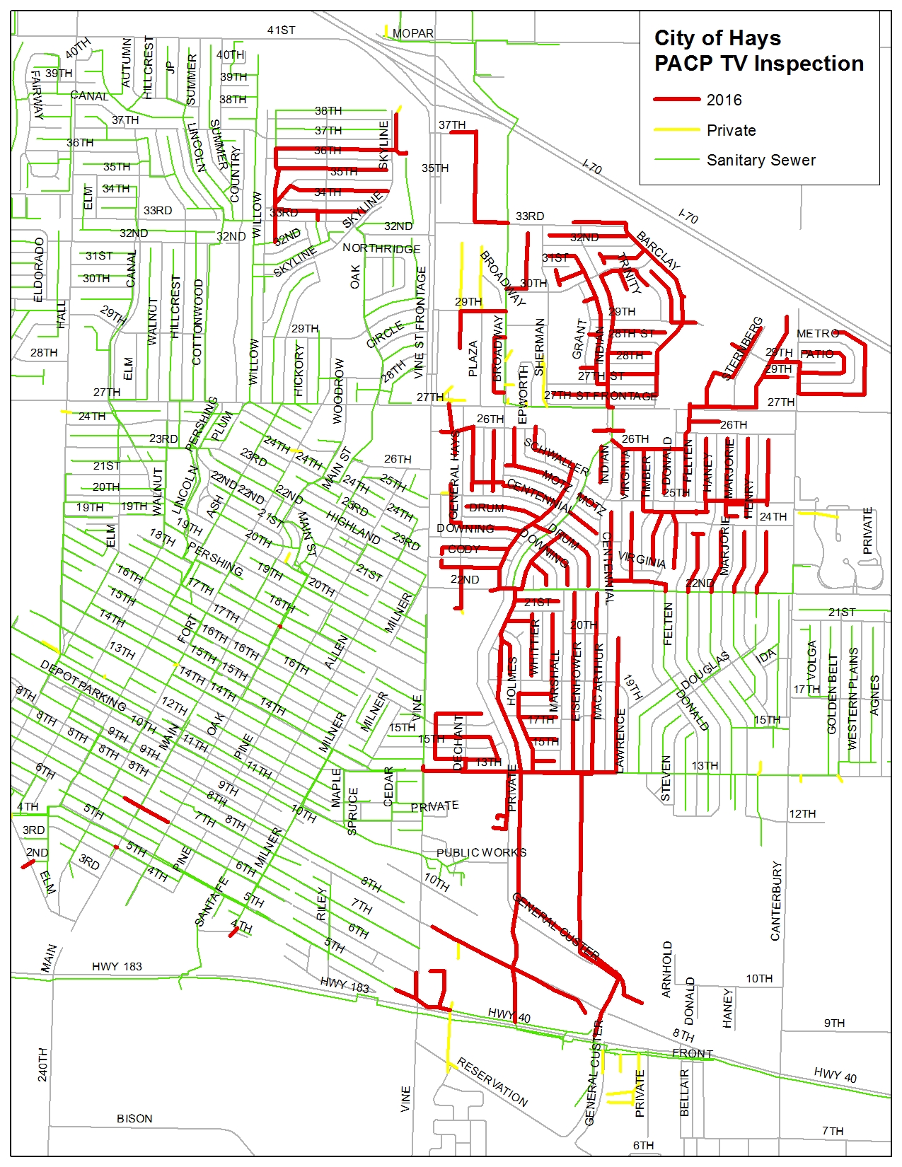 The city of Hays Utilities Department has contracted ProPipe to conduct sewer line cleaning and inspections at the locations described below and shown on the attached maps. Cleaning began Thursday, October 13, 2016 and will continue through November 22, 2016. The date may change due to breakdowns, weather, or other problems.