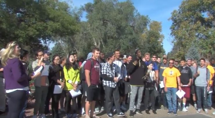 A crowd of about 50 Fort Hays State University students and a few faculty members gathered on the lawn in front of FHSU President Dr. Mirta Martin’s house Monday to show their support of her.