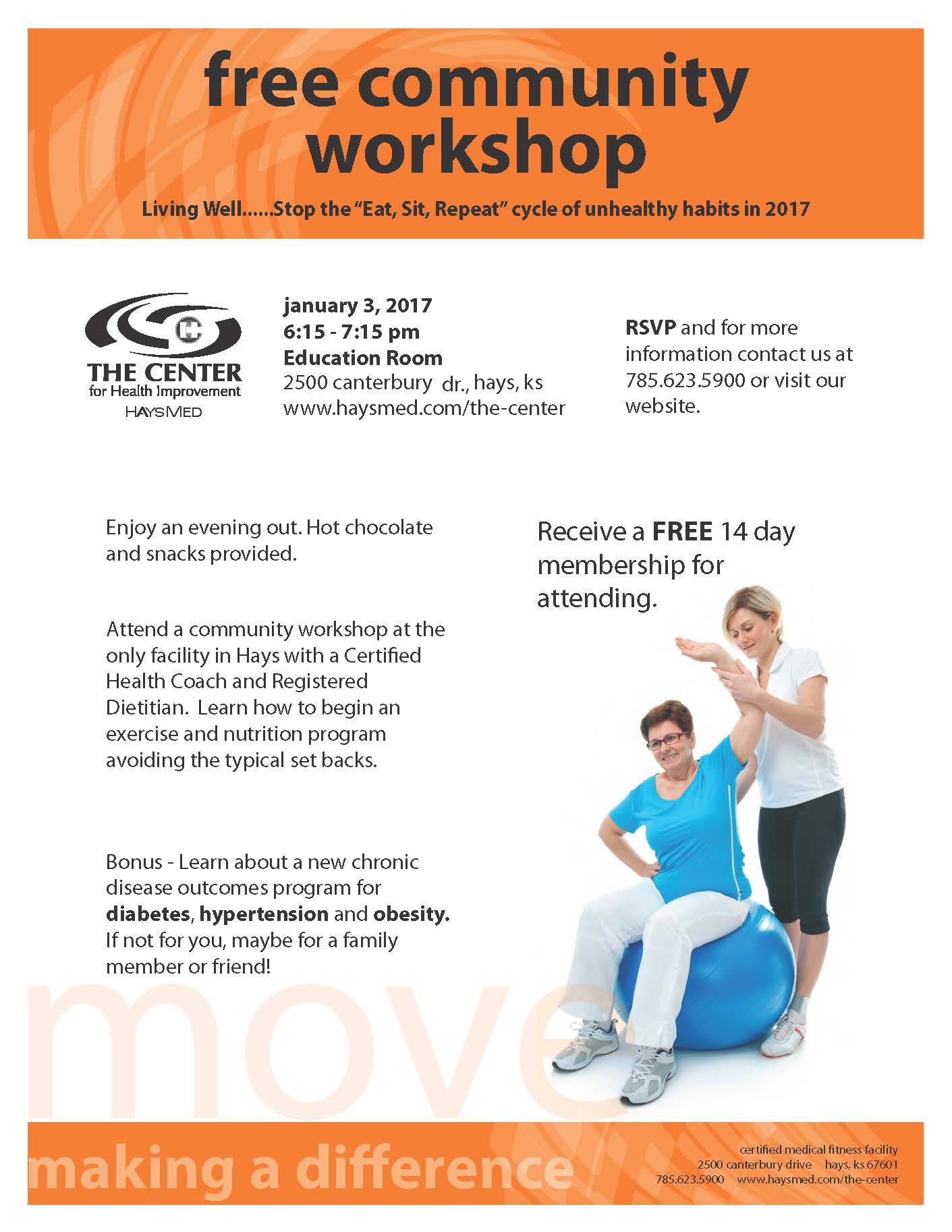 There will be hot chocolate and snacks provided and there is no registration fee. Participants will have the opportunity to use The Center fitness facilities for 14 days with a trial membership. RSVP by calling The Center at 785-623-5900.