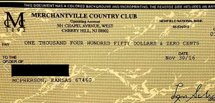 Police reported McPherson residents received checks from Merchantville Country Club in New Jersey, according to a social media report.