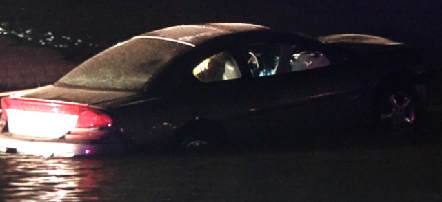 The car appeared to be hung up on a sandbar in the river’s shallow waters.