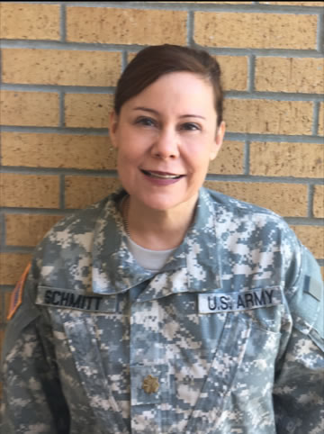 Schmitt, Scott City native, commissioned into the Kansas Army National Guard in 2006. She attended Officer Basic Course and Captains Career Course at Fort Sam Houston, San Antonio, Texas. The past 10 years, she has served in the Kansas Medical Detachment under 69th Troop Command as a nurse practitioner in Lenexa.