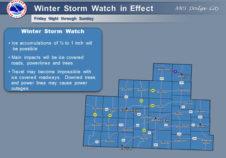 Significant ice accumulations possible this weekend. The potential exists for ice accumulations greater than ¾ of an inch. #kswx pic.twitter.com/xL5xqPJB51