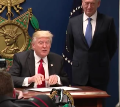 The president signed the executive action at the Pentagon, where he met with the joint chiefs of staff and participated in a ceremonial swearing-in for Defense Secretary James Mattis.