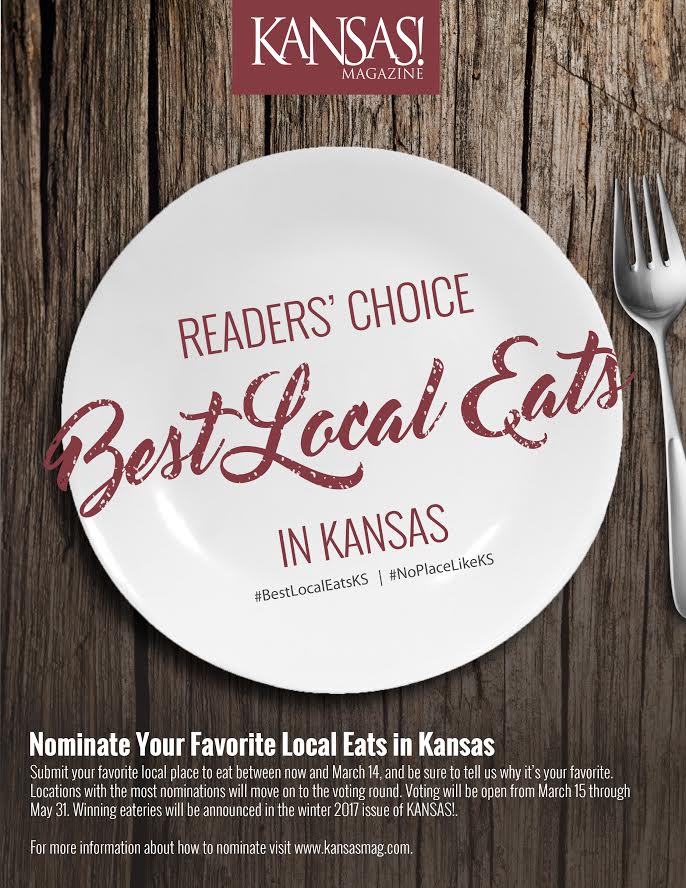 TOPEKA – KANSAS! magazine, the state’s premier travel magazine, invites readers to nominate their favorite local eateries in Kansas for the magazine’s third annual readers’ choice issue. Only local restaurants, cafes, food trucks, bakeries, and other eateries will be will be considered. Nominations opened Wednesday, February 1, and will be collected through March 14.