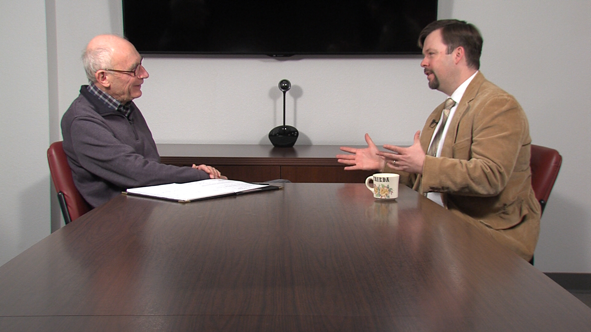 Mike Cooper visits with assistant professor of English at Fort Hays State University, Dr. James Austin about his recent research grant.