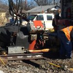 A Union Pacific employee swings a sledge hammer at the railroad tracks late Wed. morning at the Elm Street crossing.