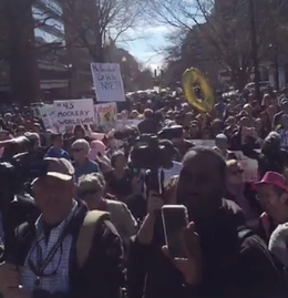 Dozens marched through midtown Atlanta for a rally named with a Georgia flavor: “ImPEACH NOW! (Not My) President’s Day March.”