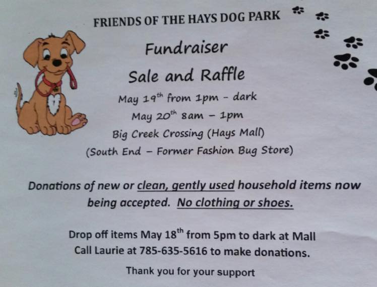 Donations accepted now for Friends of the Hays Dog Park garage sale Posted on March 20, 2017 (Click to enlarge) The Friends of the Hays Dog Park will have a fundraising sale in May. We are currently accepting donations for the sale now. If you have items to donate, please contact Laurie Mortinger at (785) 635-5616.