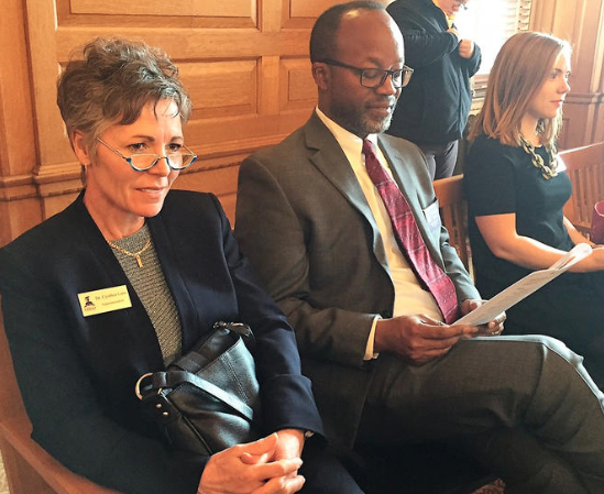 Cynthia Lane, left, superintendent of the Kansas City Kansas School District, and David Smith, the district’s chief of staff, listen Tuesday to the outline of a new school funding formula.