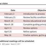 Amber Beverlin, project manager for DLR, updated the board on the schedule DLR presented to the board in January. The schedule features seven different workshops from February to May as a way to gauge where the USD 489 schools are at as far as observing facility conditions and educational environment and getting feedback from faculty, students, and community members.