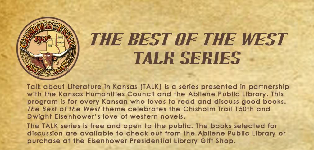 The TALK series is conducted through a partnership with the Kansas Humanities Council, the Abilene Public Library and the Eisenhower Presidential Library. “The Best of the West” theme celebrates the Chisholm Trail 150th and Eisenhower’s love of western novels.