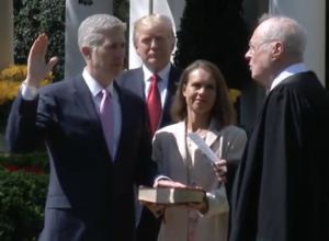 The 49-year-old appeals court judge from Colorado is being sworn in Monday after a bruising fight that saw Republicans change the rules for approving Supreme Court picks – over the fierce objection of Democrats.