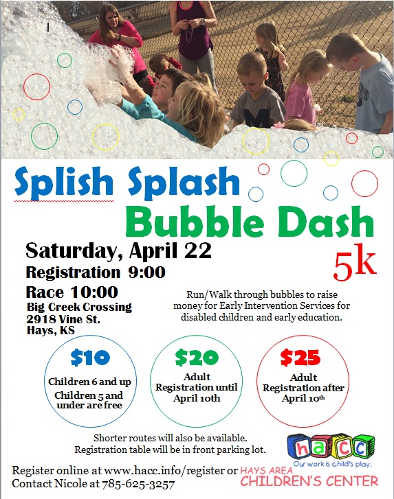 The first Splish Splash Bubble Dash 5k will be held on Saturday, April 22, at Big Creek Crossing on Vine Street in Hays. The event is put on by the Hays Area Children’s Center and is an effort to raise money for Early Intervention Services for disabled children and early education.