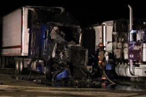The semi was completely destroyed and flames scorched the side of another tractor-trailer parked nearby. There were no injuries.