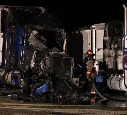 The semi was completely destroyed and flames scorched the side of another tractor-trailer parked nearby. There were no injuries.