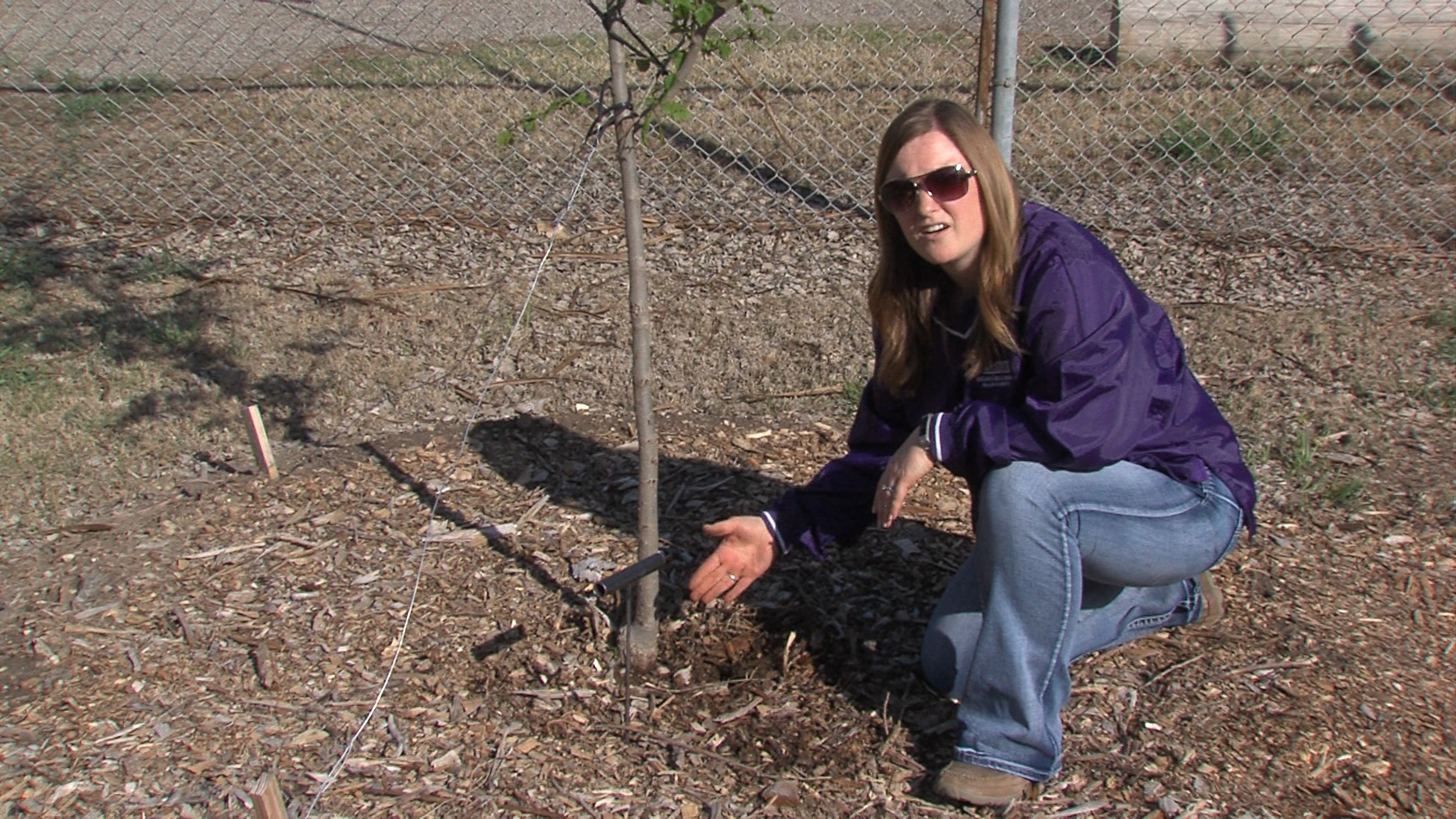 Holly Dickman explains the benefits of putting mulch around a freshly planted tree.