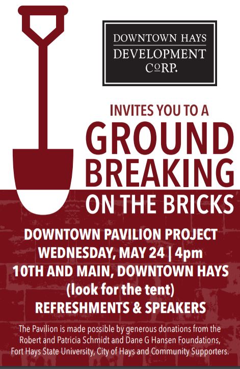 Downtown Hays Development Corporation (DHDC) announces the rescheduled date for the Downtown Pavilion Project ground breaking. The ceremony will now take place, Wednesday, May 24th at 4 p.m. at 10th and Main.