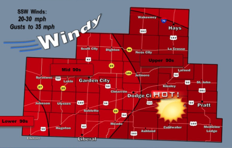 Today Sunny, with a high near 96. Windy, with a light and variable wind becoming south 21 to 26 mph in the morning. Winds could gust as high as 36 mph.