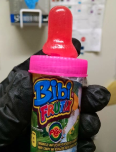 The candy is in the shape of a small baby bottle and is labeled “Bibi Frutix” and according to the label was made in Mexico.