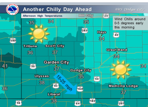 Today Sunny, with a high near 34. Wind chill values as low as zero. Northwest wind 8 to 14 mph.