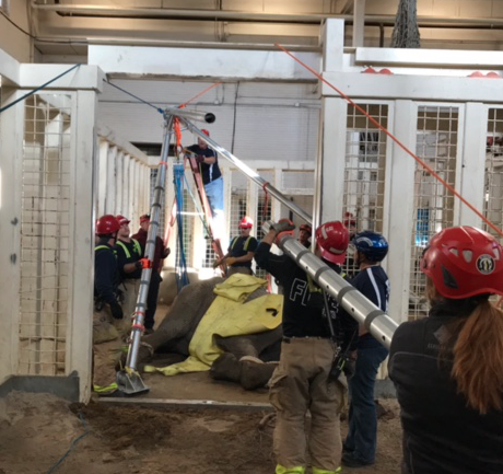 things. Not long after the first meeting in 2013, the fire department brought someone new into the picture – the Animal Search and Rescue team of the Emergency Equine Response Unit. Once or twice a year over the last three years, Topeka Zoo staff, Topeka Fire Department personnel and the Animal Search and Rescue team have trained on different down elephant scenarios. Each training led to enhancements in both equipment and technique. This morning, that training paid off.