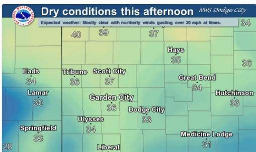 RHs will dip into the teens across far southwest Kansas with 20s elsewhere. Burning is discouraged! #kswx #nwsddc pic.twitter.com/X8xrflq3Ck