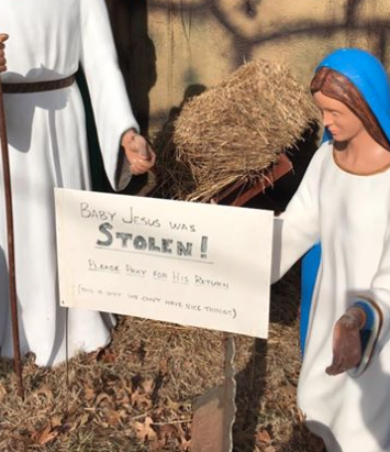 A sign staked outside the nativity reads: “Baby Jesus was STOLEN! Please pray for his return.” The church said it “can’t have nice things” in smaller letters. Over the years, other statues have gone missing, including a camel.